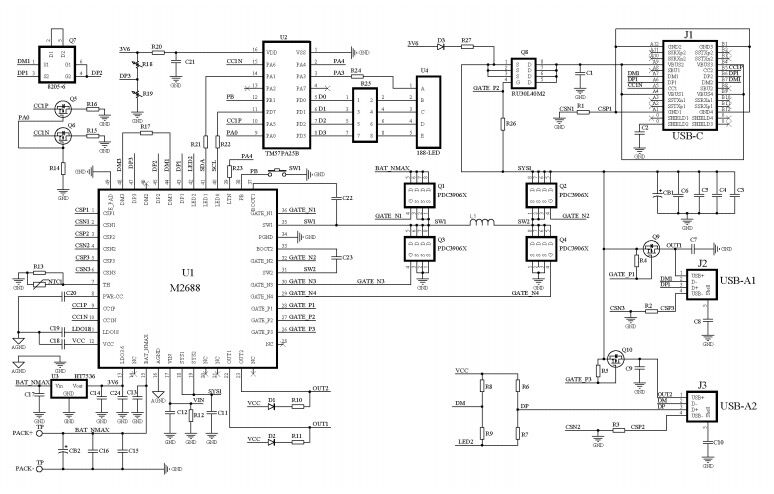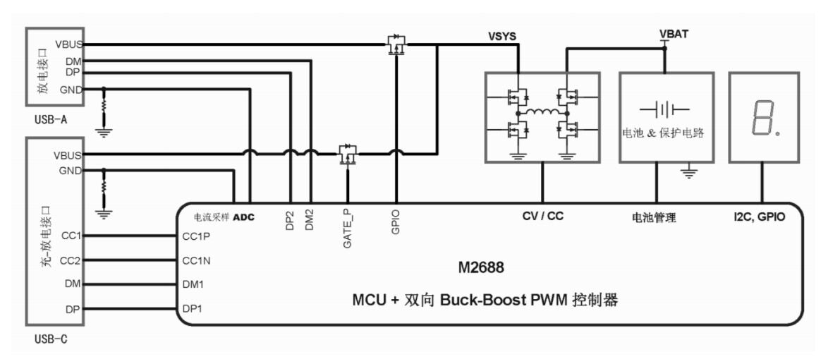 基于 M2688 的多口移动电源解决方案的简化应用电路,如下图 1.1 所示。