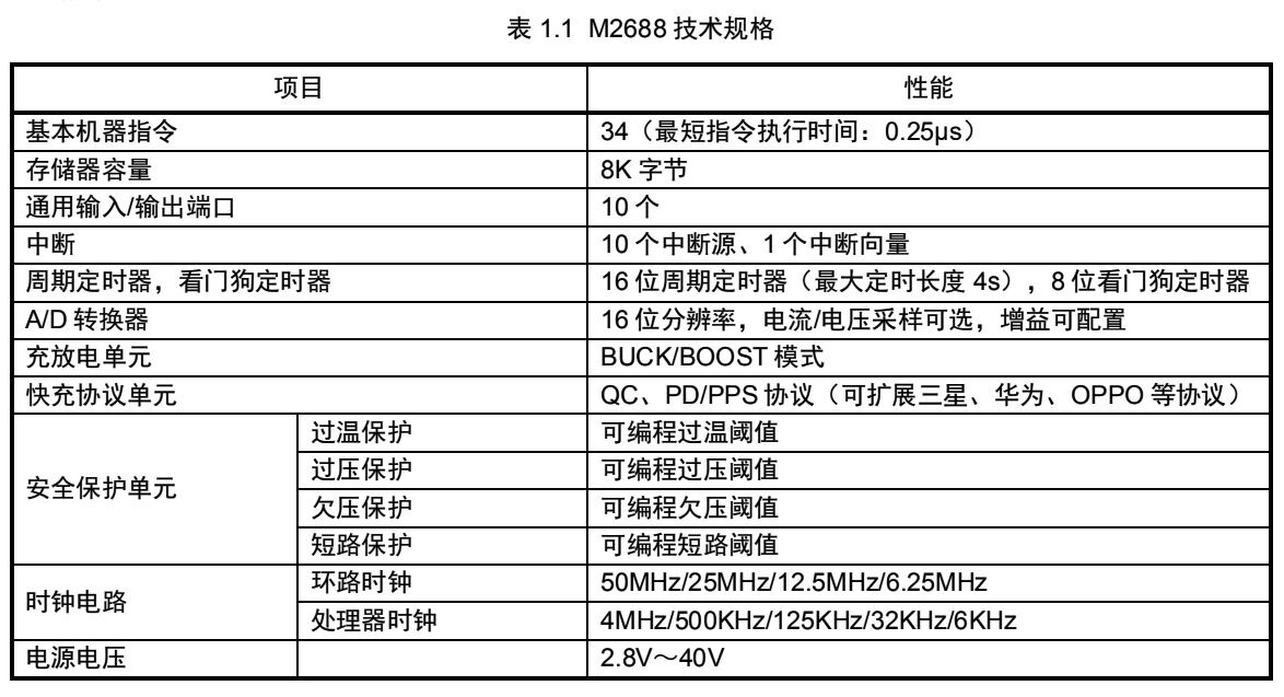 作为电源管理的专用 SOC,M2688 集成了移动电源应用方案必要的功能模块,其基本的技术规格如下表1.1 所示。