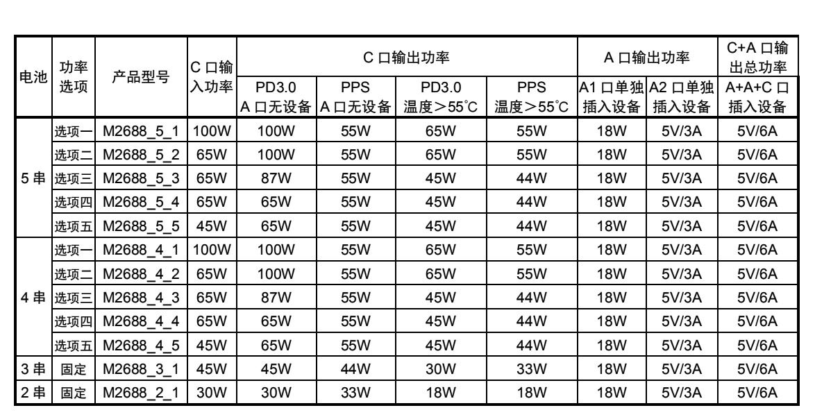 M2688 A+A+C 多口移动电源应用方案,A1 口支持放电功能,输出功率固定为 18W;A2 口支持放电功能,输出功率为 15W,当 A+A+C 口都有设备插入时,最大功率可达到 30W;C 口既支持放电功能,也支持充电功能。此外,根据具体应用要求,产品可配置为不同的型号对应不同的输出/输入功率。各配置选项的技术规格如下表所示。
